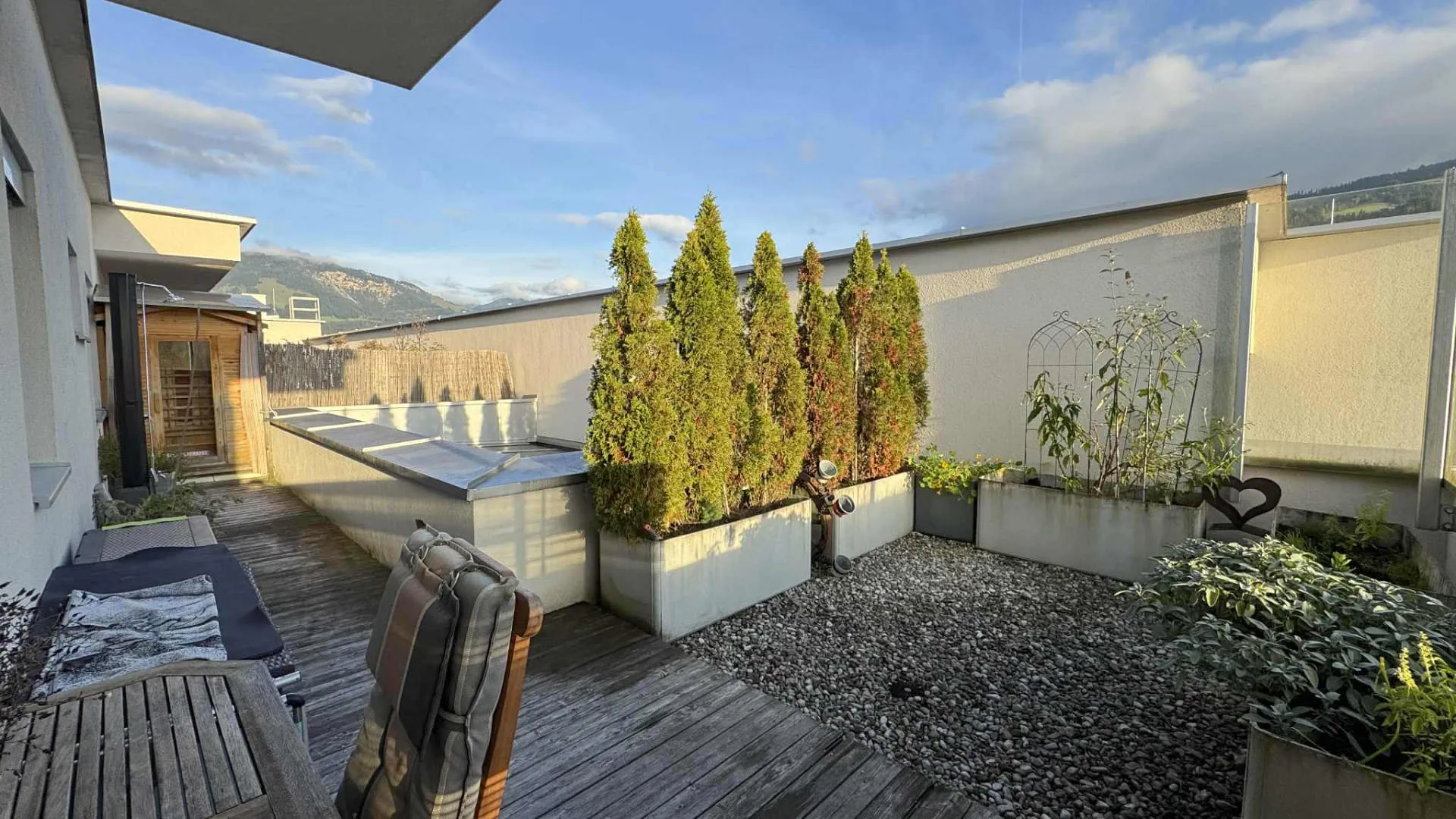 Die Dachterrasse verfügt über eine Sauna, dank dem klugem Grundriss genießen Sie hier ungestörte und entspannte Stunden mit einem atemberaubenden Blick auf den Kitzbüheler Horn und auf die umliegende Bergwelt. Das Wohnzimmer bietet unverbaubaren Ausblicke auf faszinierende Sonnenuntergänge und auf den Wilder Kaiser.