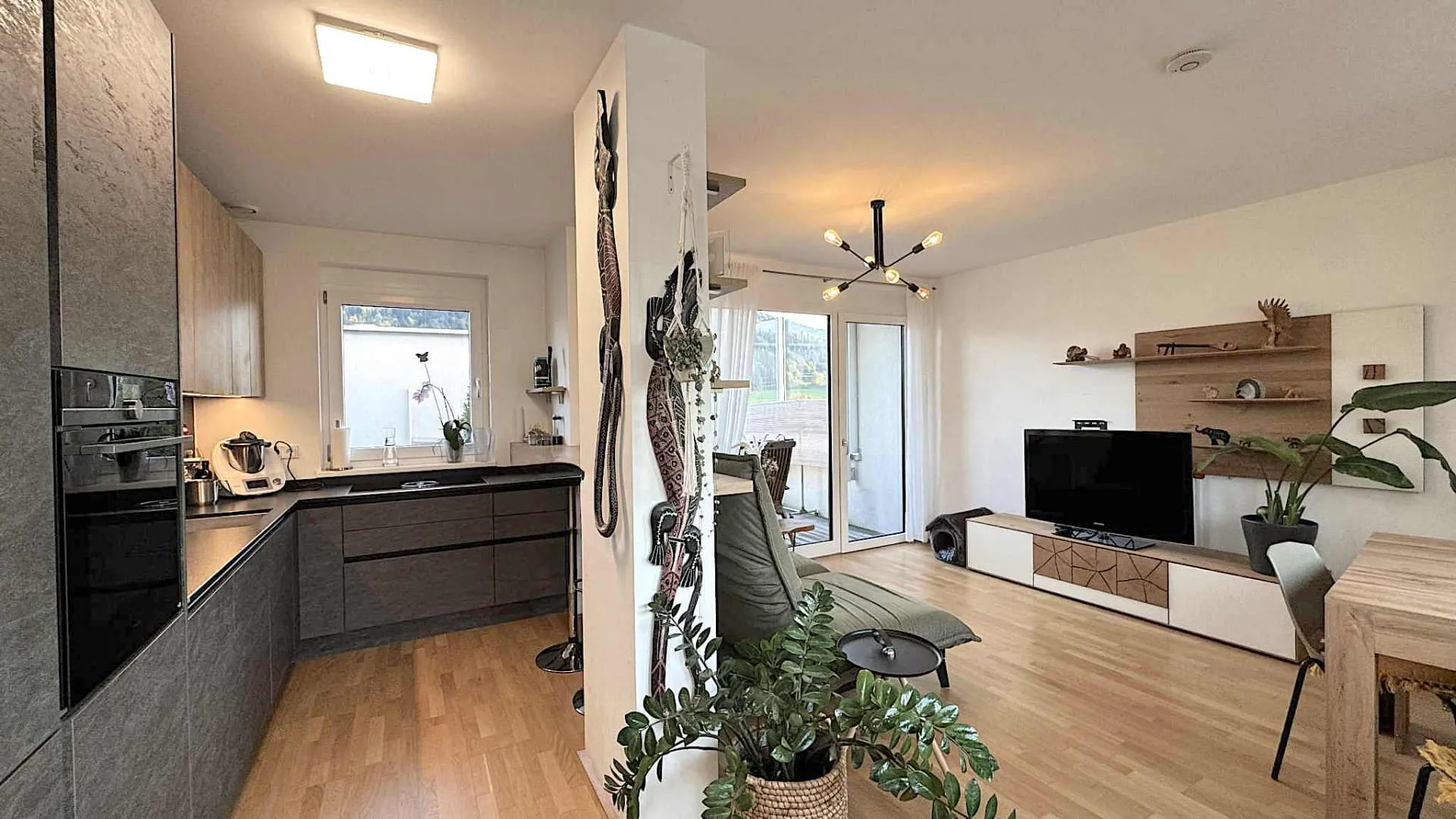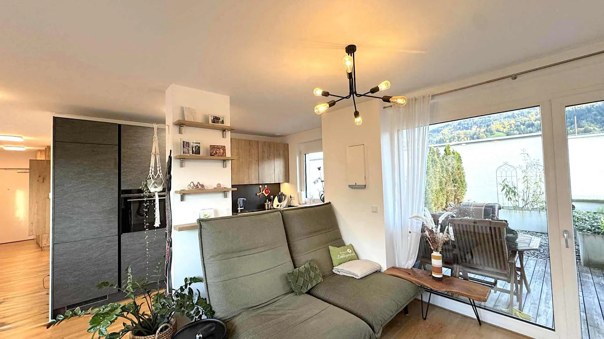 Die offene Küche ist mit einer Bora-Herdplatte mit integriertem Abzug sowie einem Siemens- Dampfbackofen ausgestattet. Im Wohnbereich sorgt eine edle Rolf Benz Couch für stilvolles Ambiente und Gemütlichkeit. Maßgefertigte Einbauschränke vom Tischler bieten optimalen Stauraum und fügen sich harmonisch ins Gesamtbild ein.